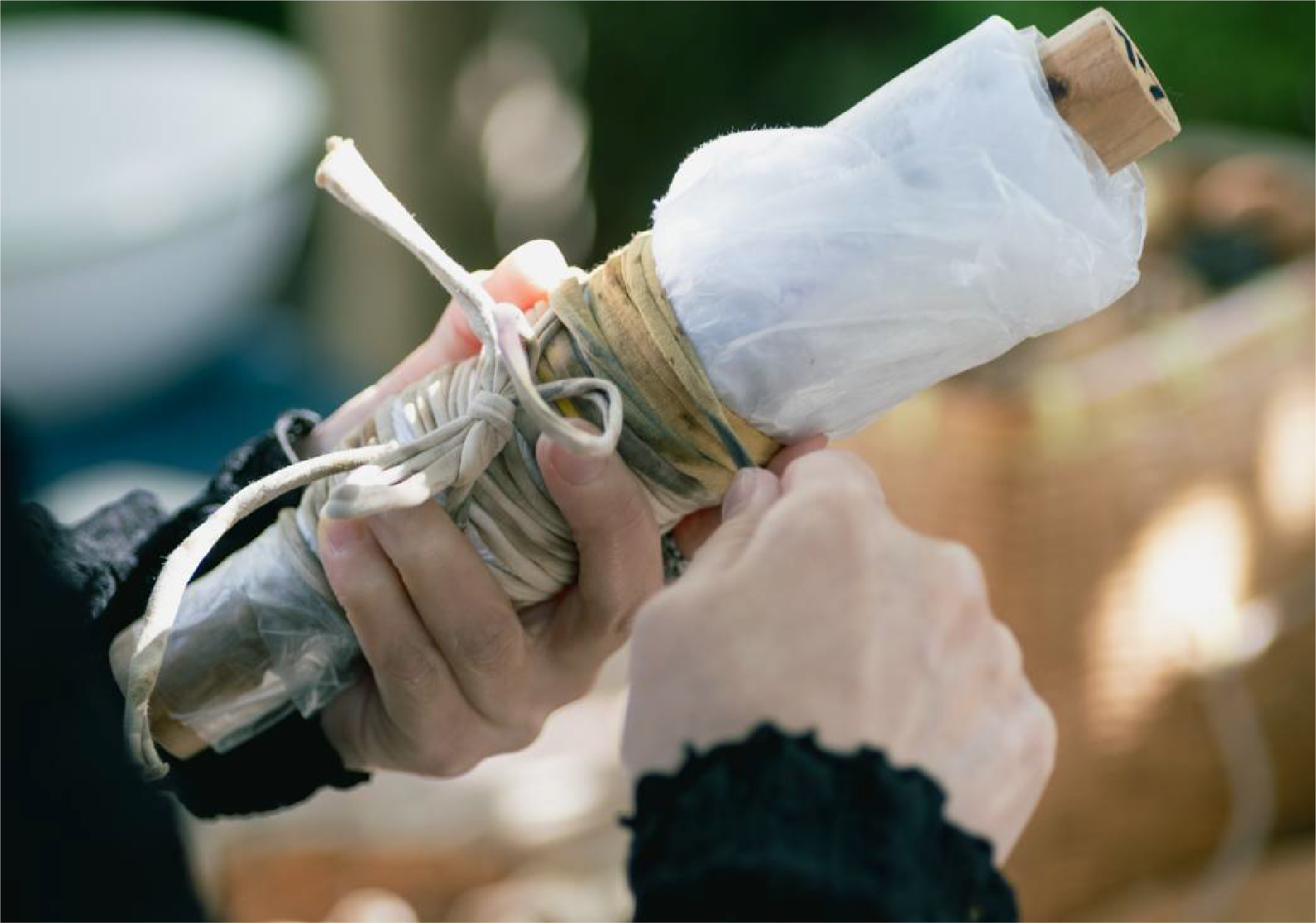 草花を散りばめた布を、棒に巻き、紐で結ぶ。