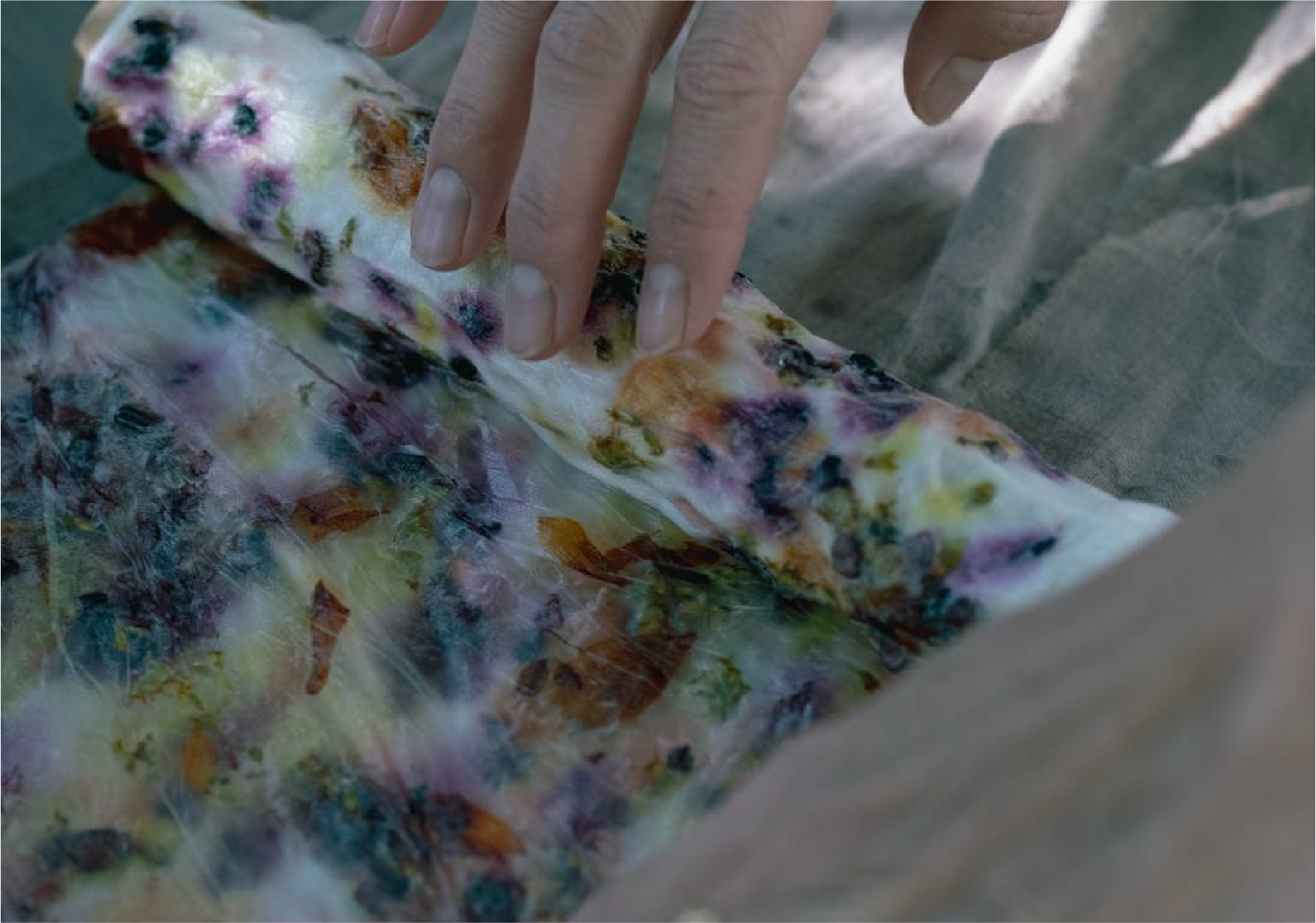 草花に触れ、散りばめて、蒸しあげて草花を転写する染め体験。